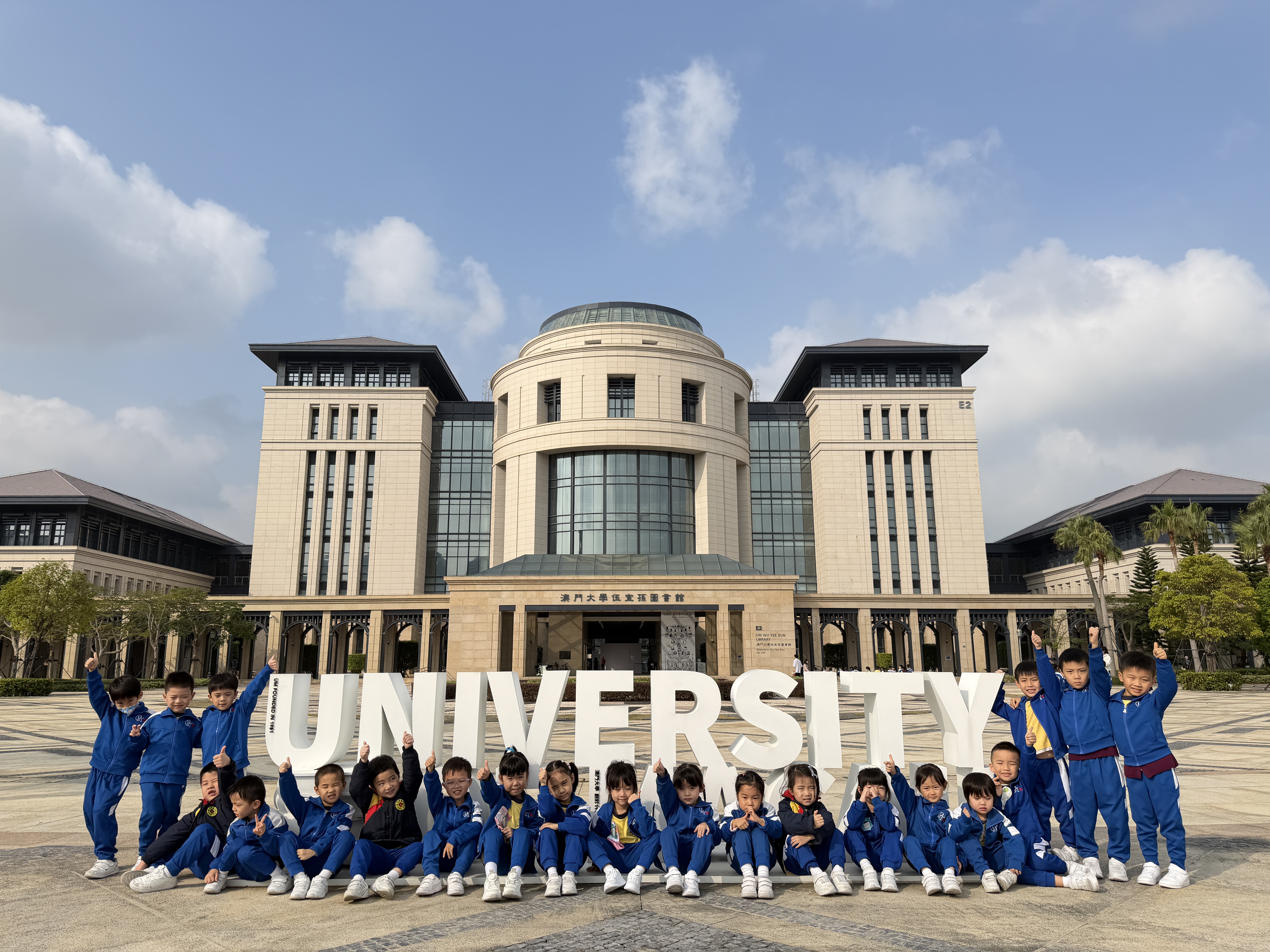 為拓展幼兒視野,激發幼兒的學習興趣,培道幼稚園日前組織了一場愉快的校外學習活動<<做一日大學生>>,老師帶領K3級小朋友前往澳門大學參觀,在澳門大學伍宜孫圖書館前大合照認識與感受大學校園的生活。