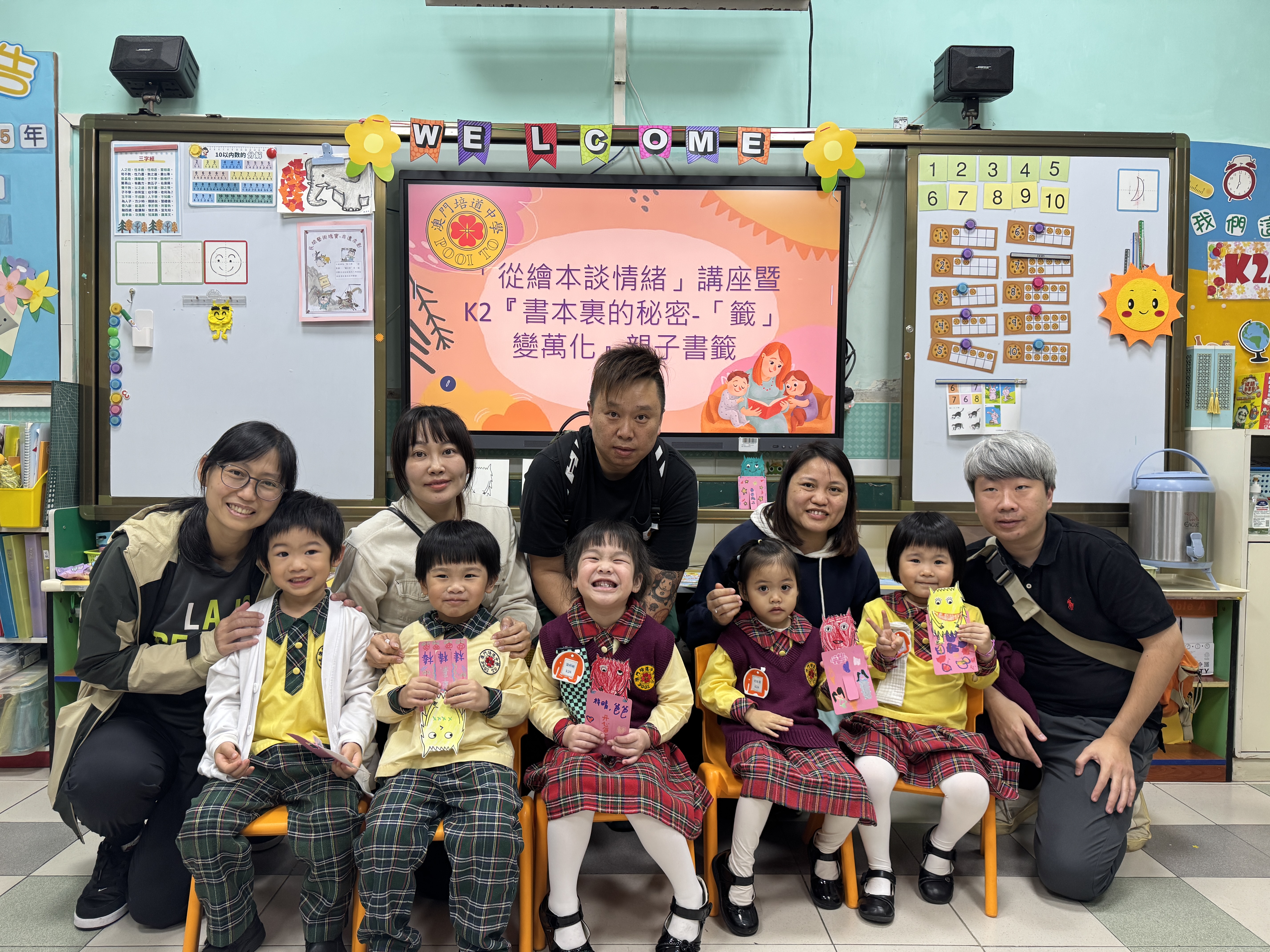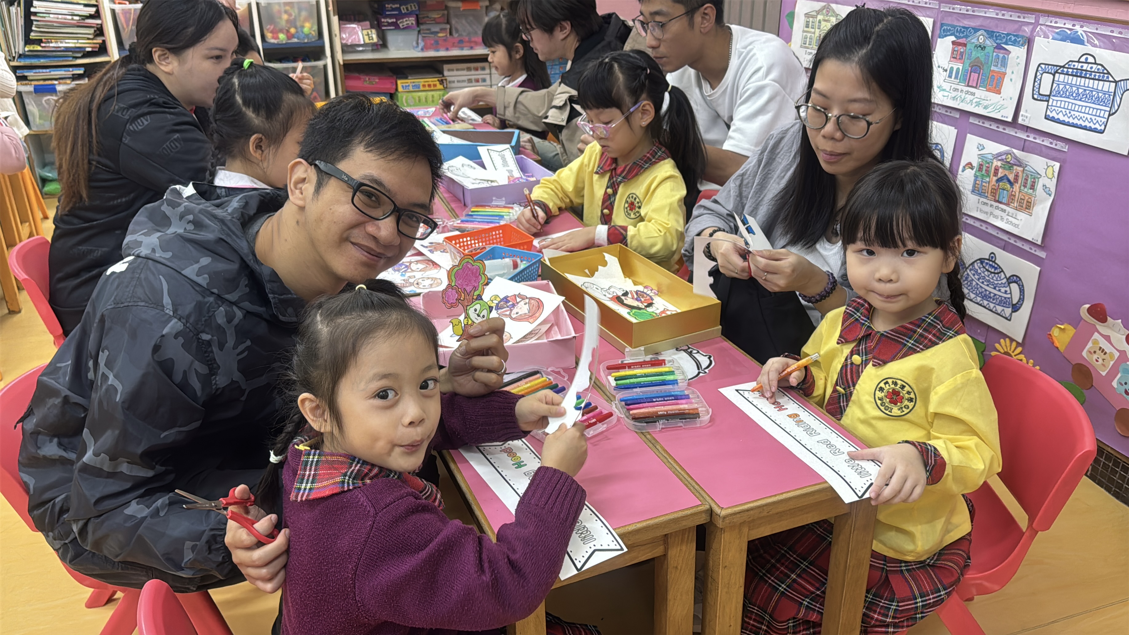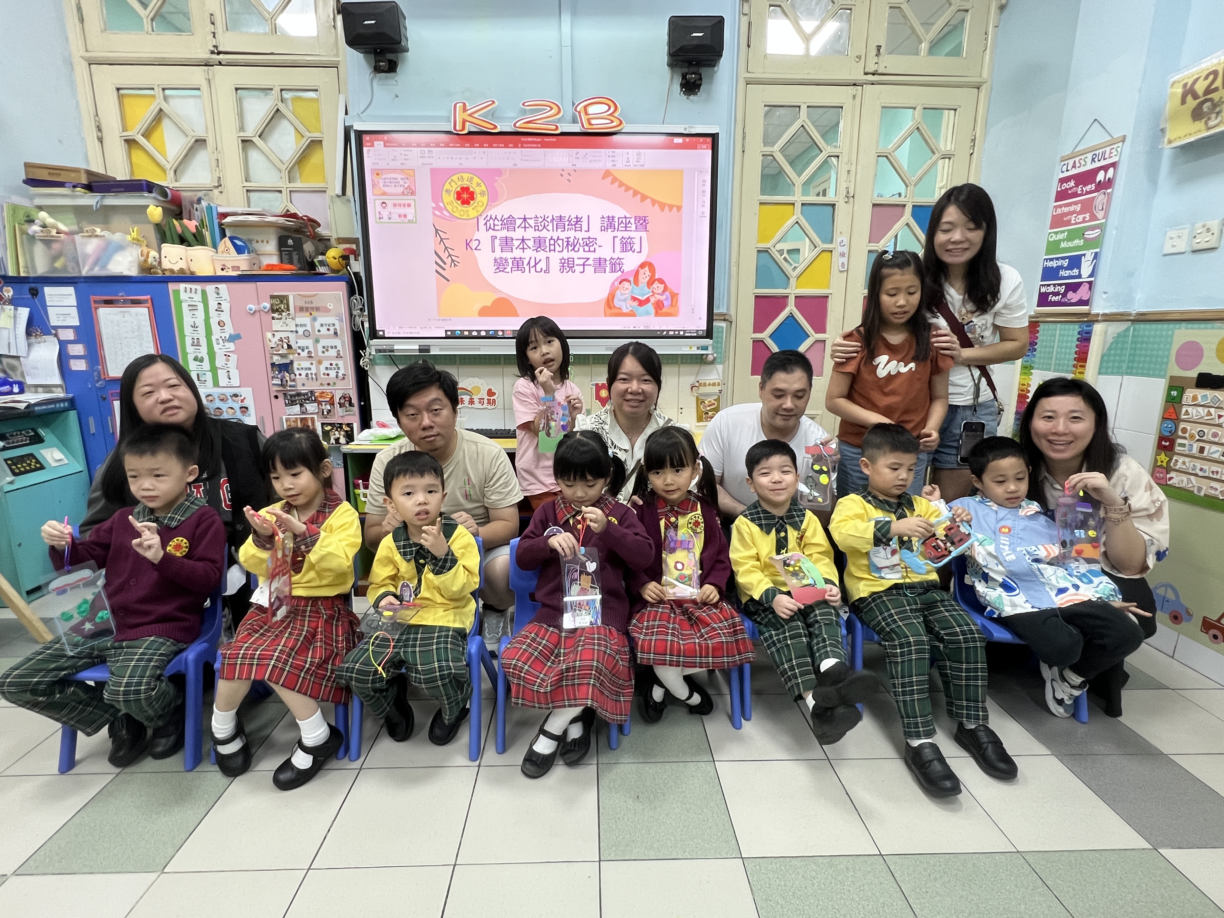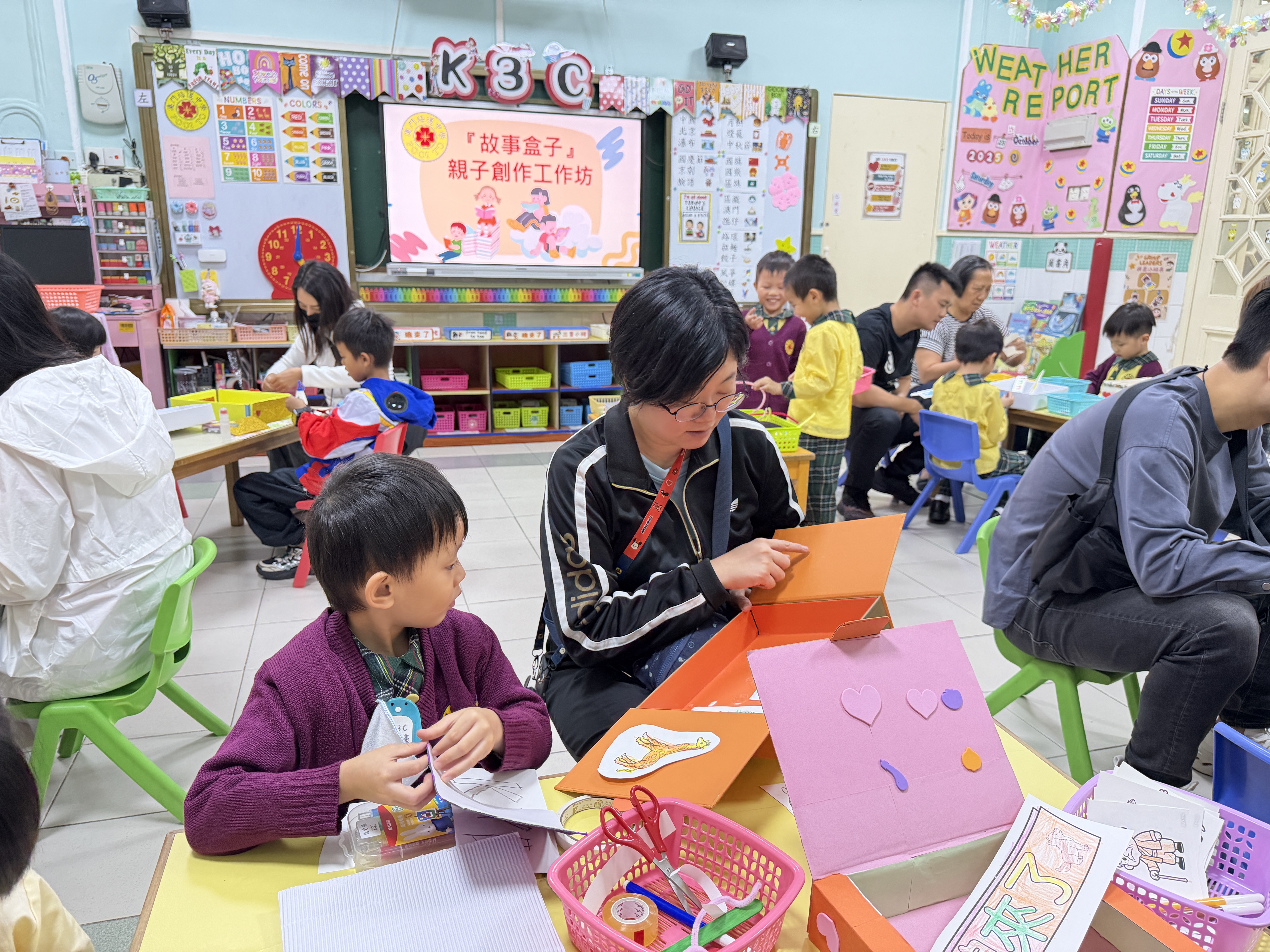 隨後進行的親子創作環節氣氛熱鬧,K3班以「中英文故事盒子」為主題,孩子與家長一起動手製作,將閱讀轉化為互動遊戲;K2班則進行「書本裏的秘密——『籤』變萬化」書籤創作,孩子們發揮創意,製作獨一無二的閱讀紀念。