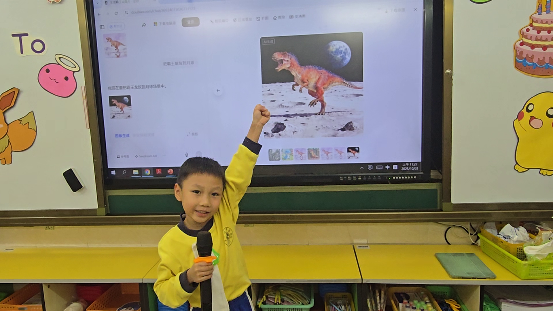 除此之外,我們還運用AI 工具生成圖片,設計趣味互動環節:鼓勵幼兒發揮想象力,用簡單語言描述心中的畫面。讓 AI 生成對應圖像,例如小朋友請AI生成霸王龍登上月球的圖片;或讓孩子上傳自己的畫作,通過 AI 進行色彩調整、場景延伸等創意優化,在這一過程中,小朋友把自己變成科學家,變成公主,變成小小太空人等,幼兒親身體驗「語言表達」與「視覺創作」的跨界聯動,直觀感受科技的神奇魅力,進一步激發對資訊科技的探索好奇心。