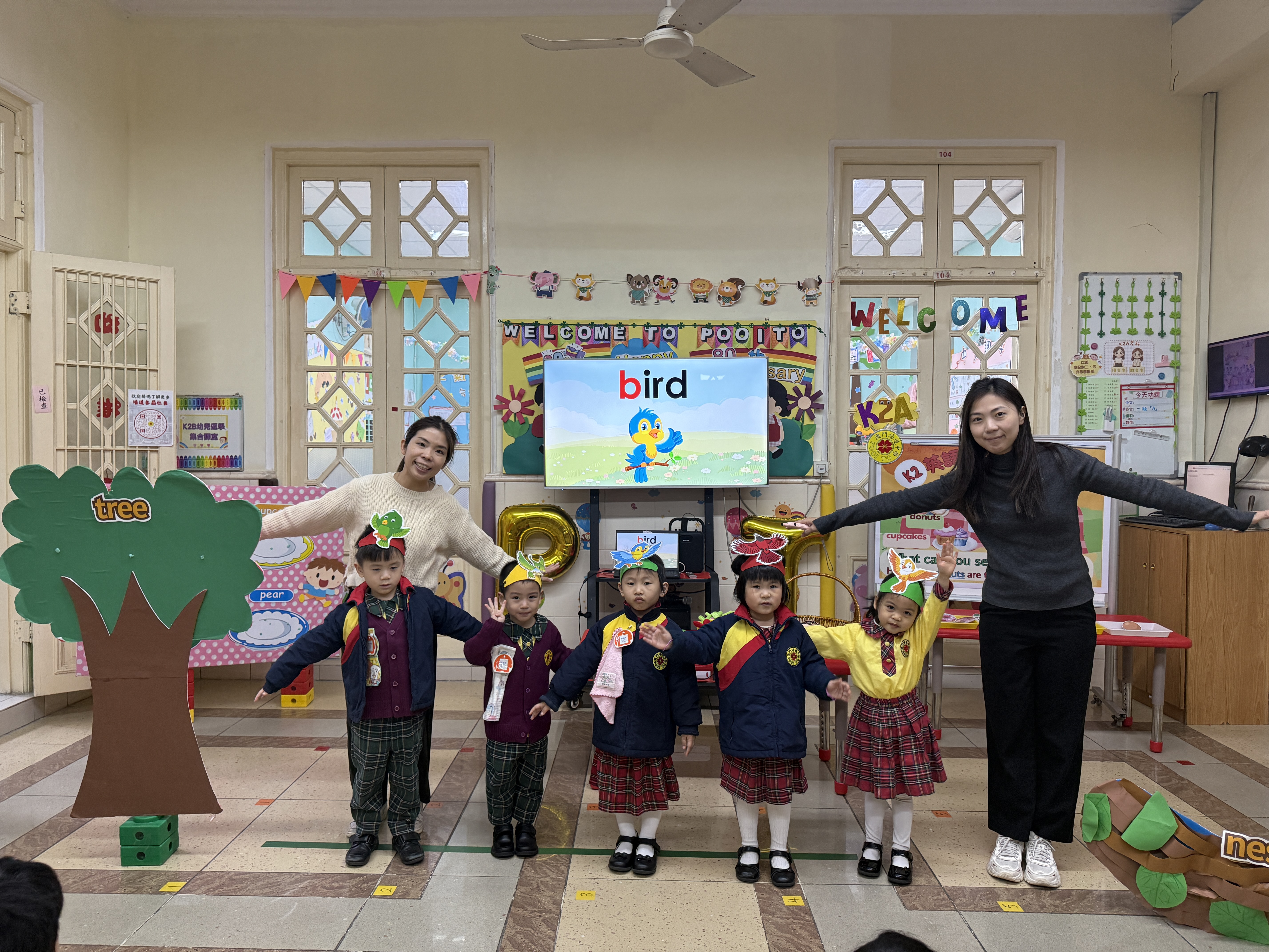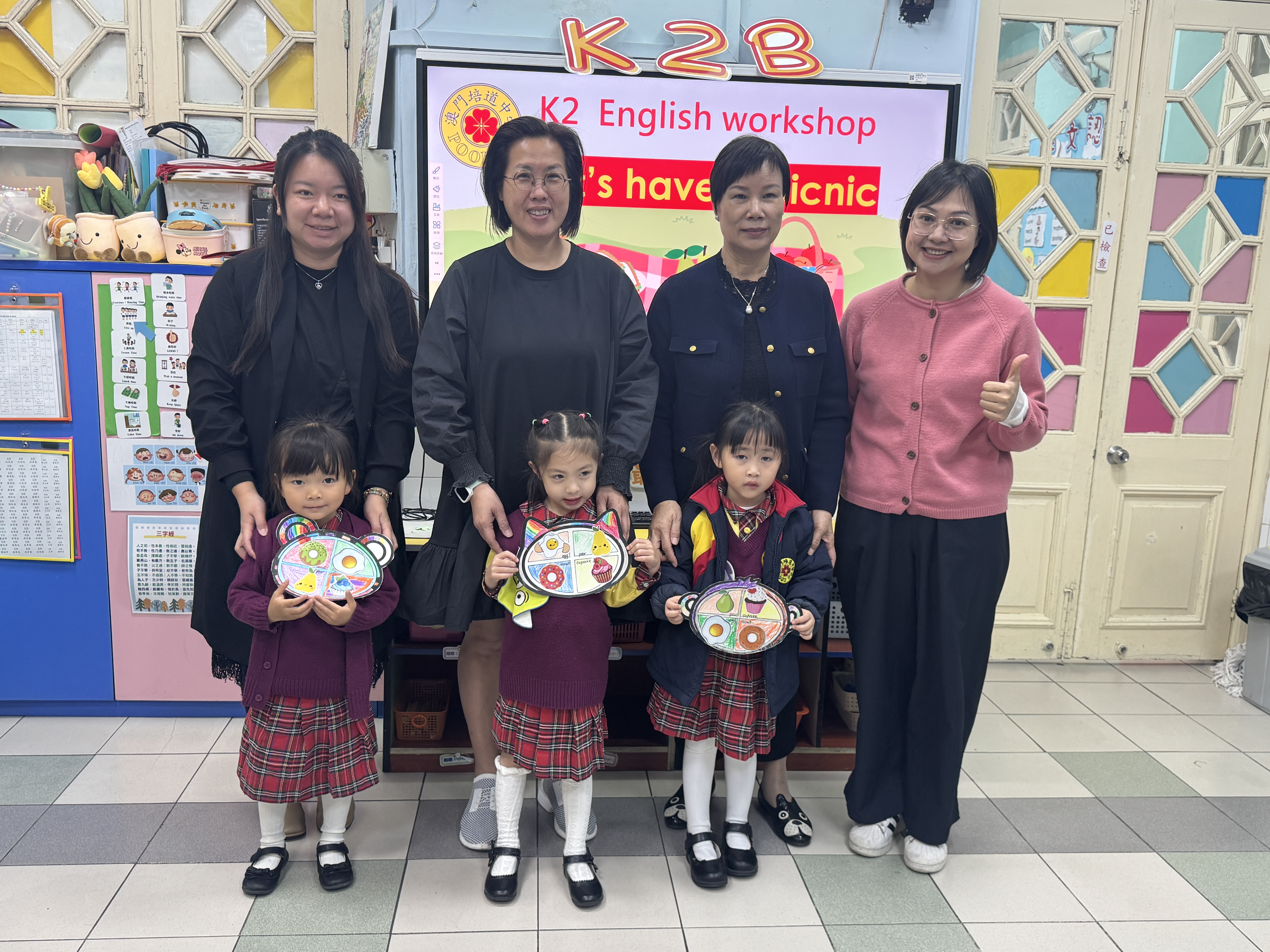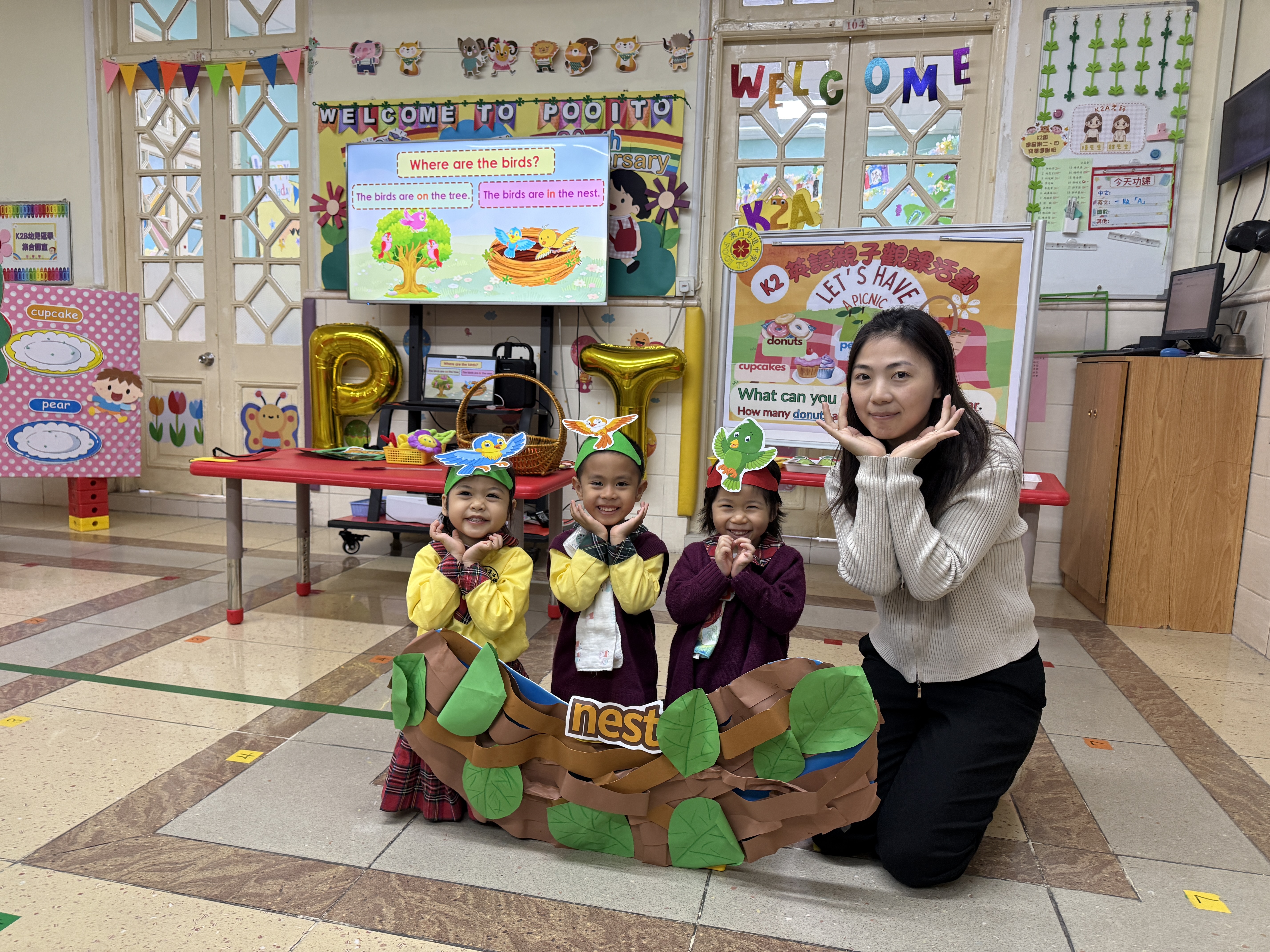 本校南灣幼稚園在K2級舉辦以「Let's Go Picnic!」為主題的英文親子觀課活動,通過生動的「郊外旅程」情境教學,幼兒在遊戲中自然掌握了「tree」、「leaf」等核心詞彙及「in/on」句型。