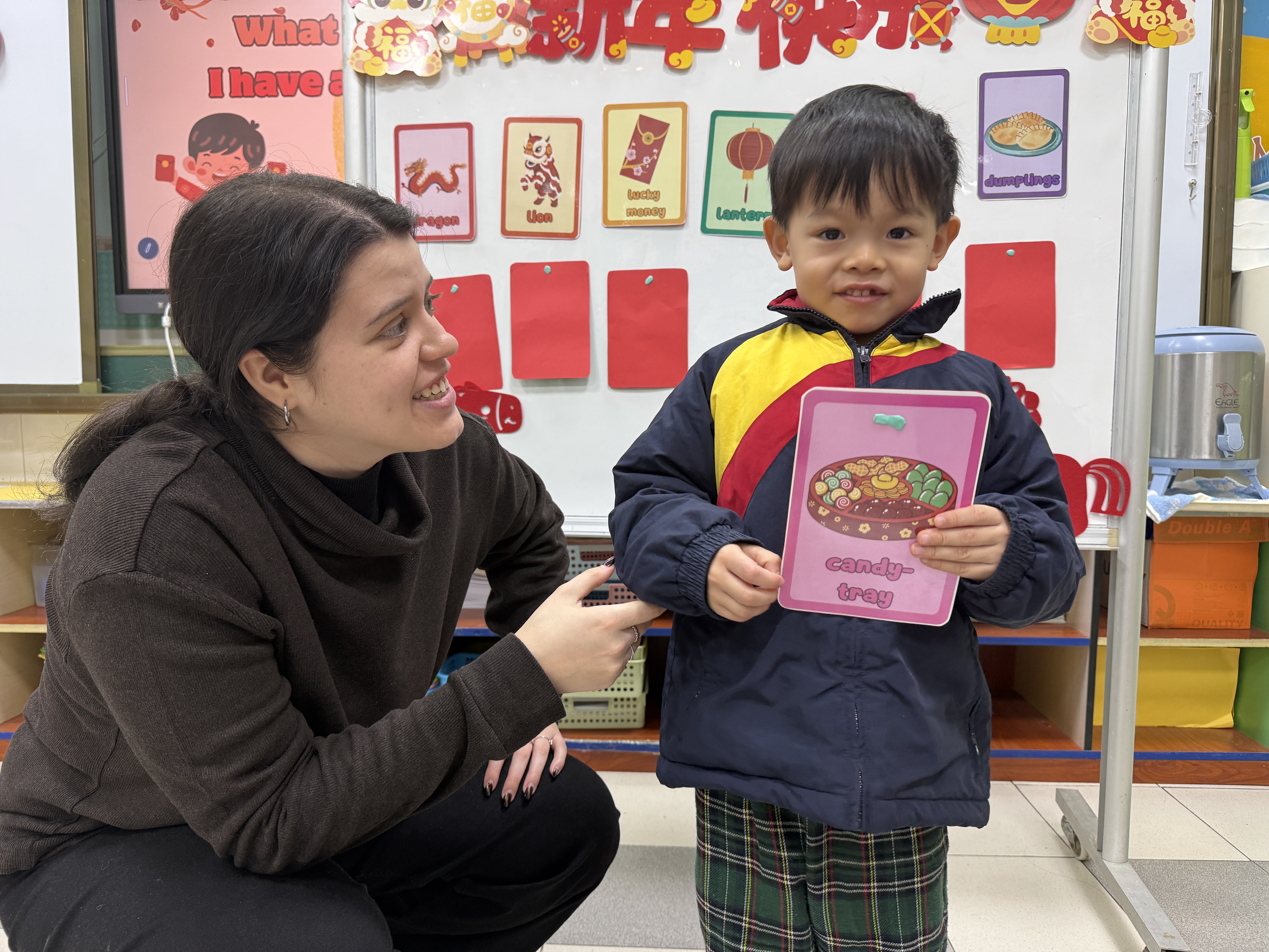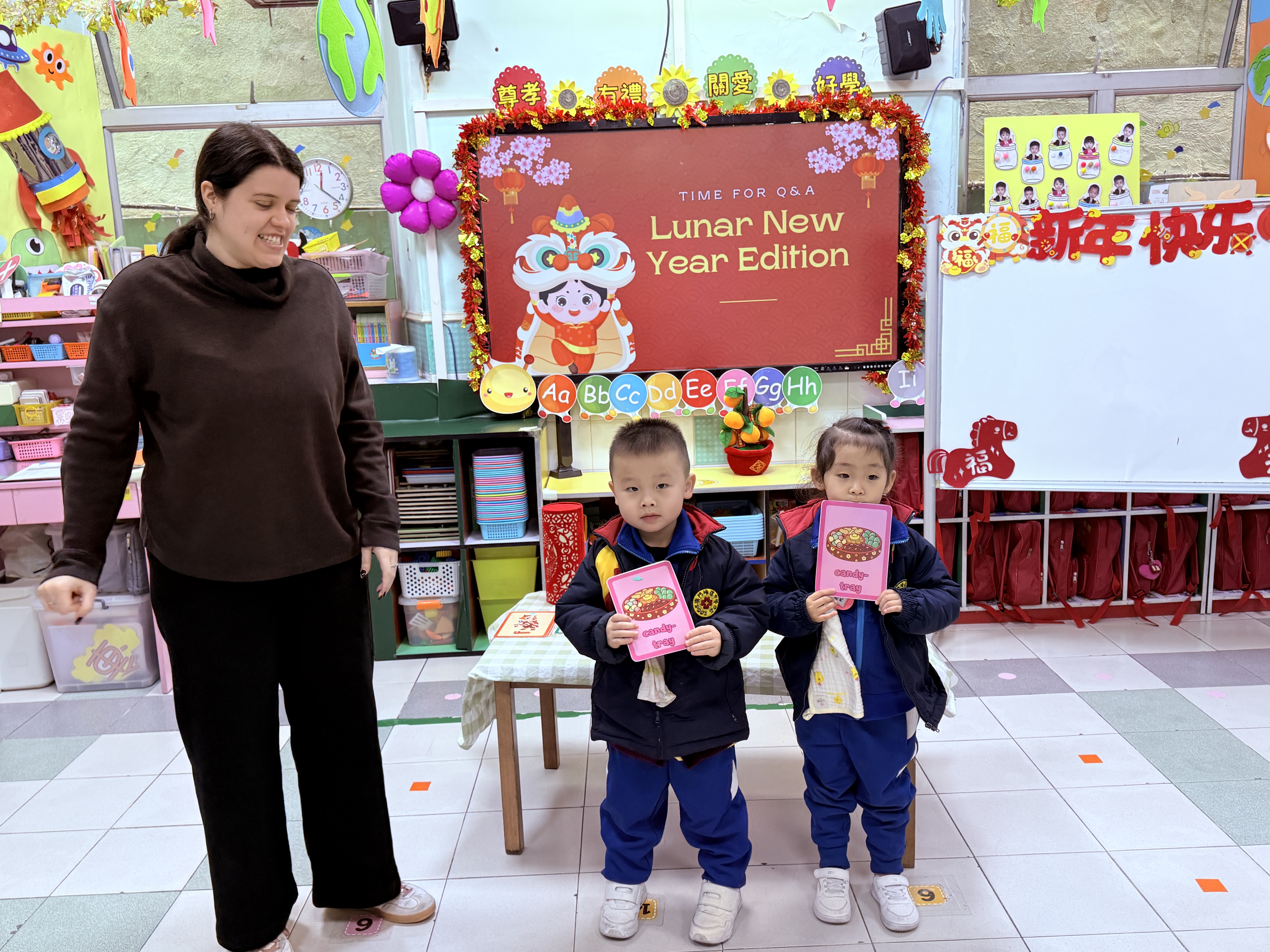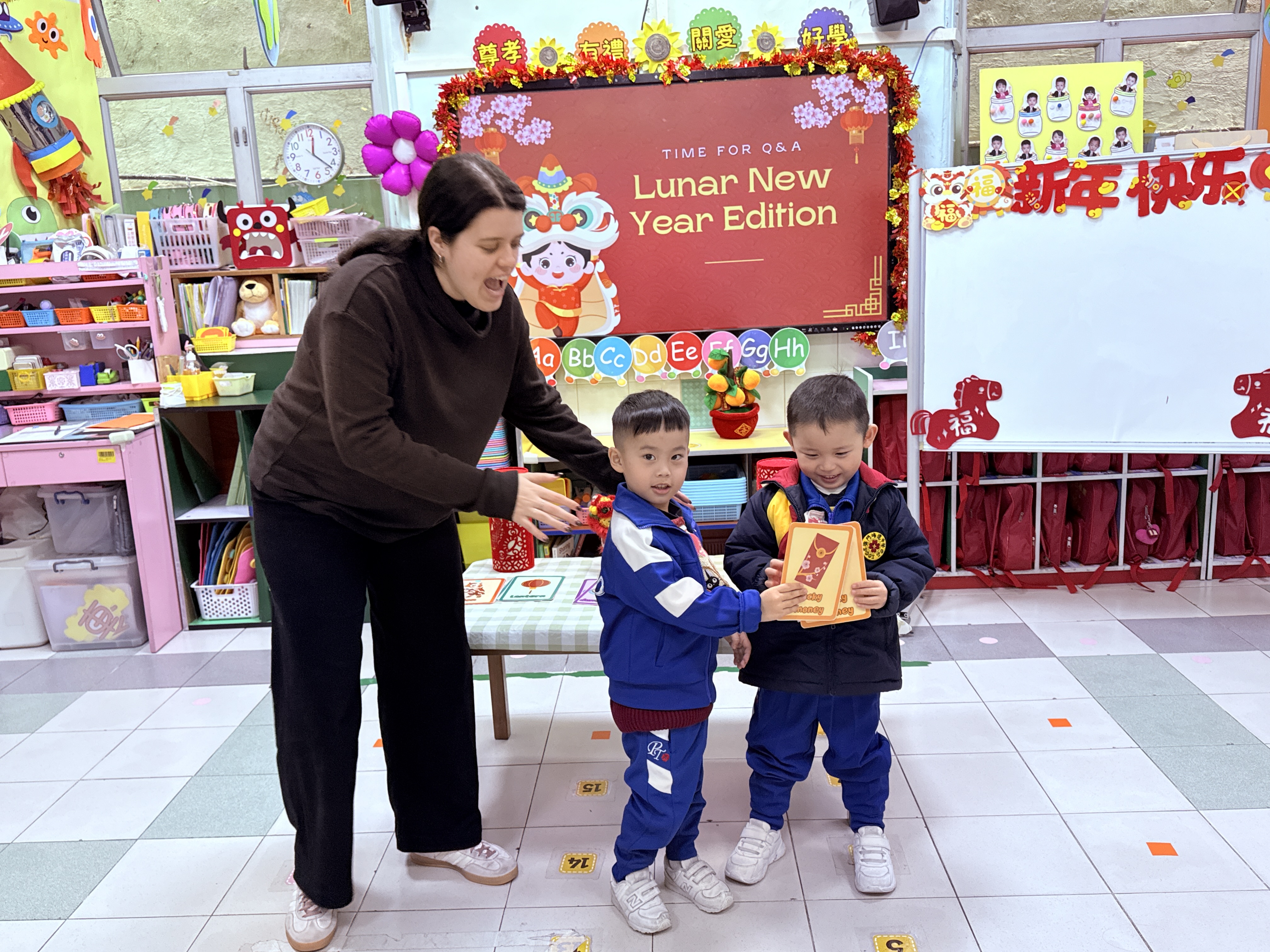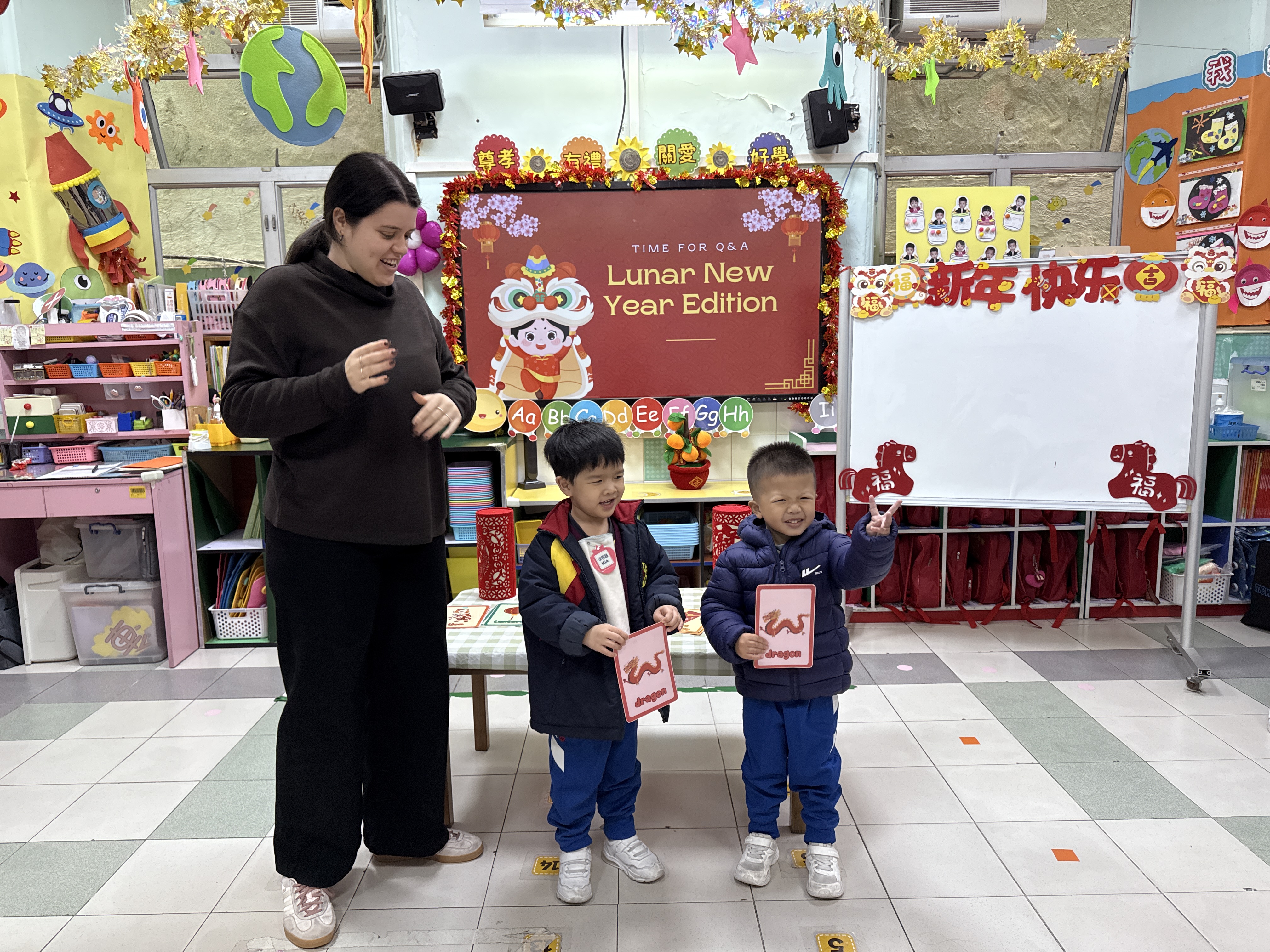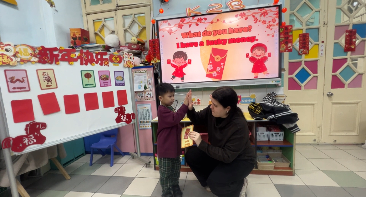 活動中,Miss Lara 以生動活潑的英語,向幼兒介紹新年的由來、傳統習俗與應節特色物品。藉着色彩鮮明的趣味圖卡,孩子們學會了新春主題英語詞彙,又學習了不同的祝福語,並在情境對話中練習實用句式。
